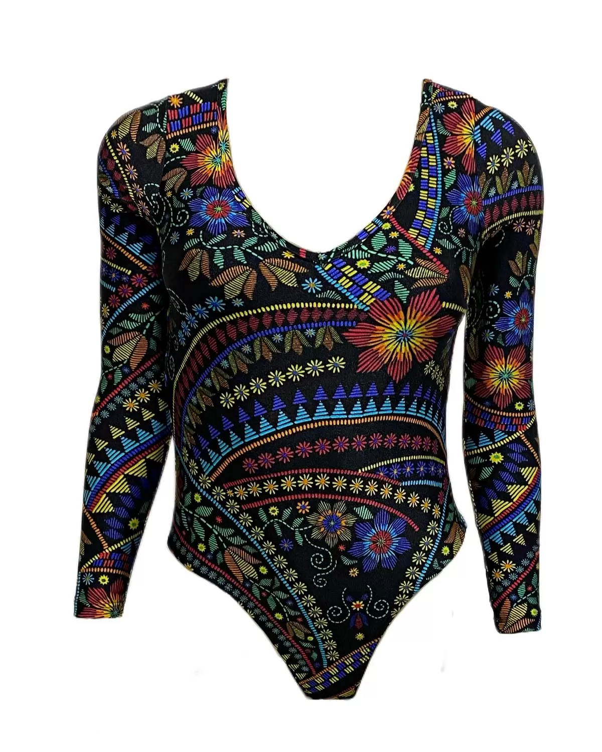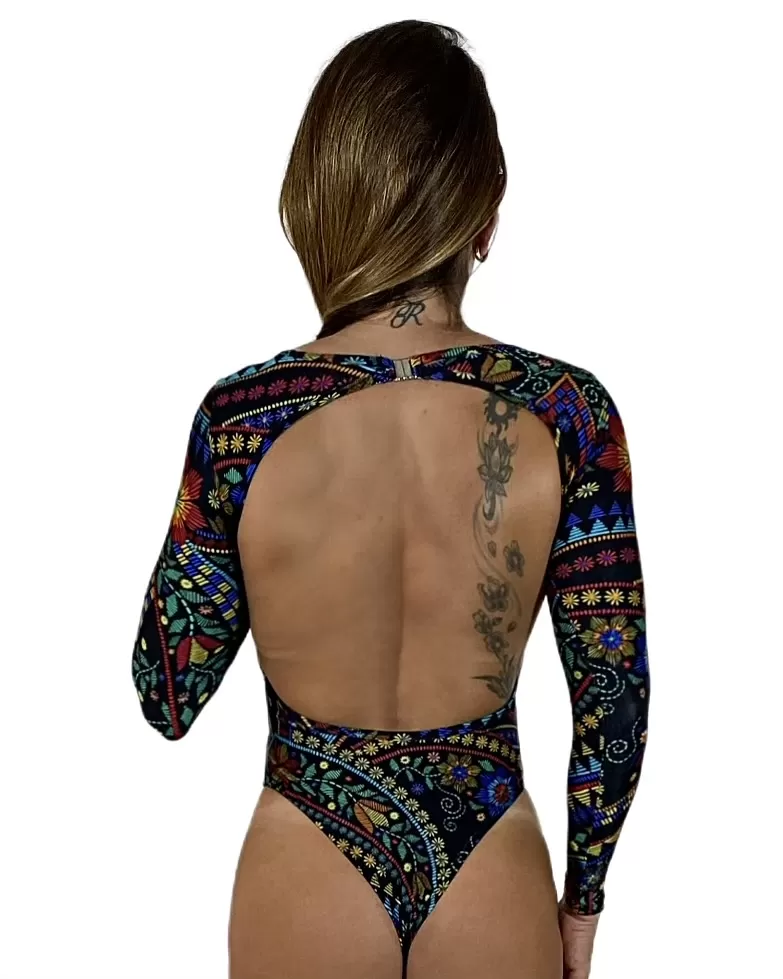 Crafted with one of the best fitness materials. Paulina Bodysuit showcases a whimsical pattern beading print. This long-sleeve style flaunts a moderate V-neckline and an striking open back.